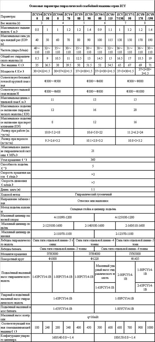 Основные параметры гидравлической сваебойной машины серии ZCY